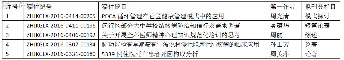 《中华健康管理学杂志》于2016年7月14日在中华医学会召开了定稿会,参会专家有解放军空军航空医学研究所武留信教授、中华预防医学会李明教授、北医三院曾琳教授、解放军第306医院刘彦君教授、北京大学医学部刘宝花教授、北京医院刘安楠教授和北京安定医院西英俊教授。经讨论,本次通过的稿件信息如下: